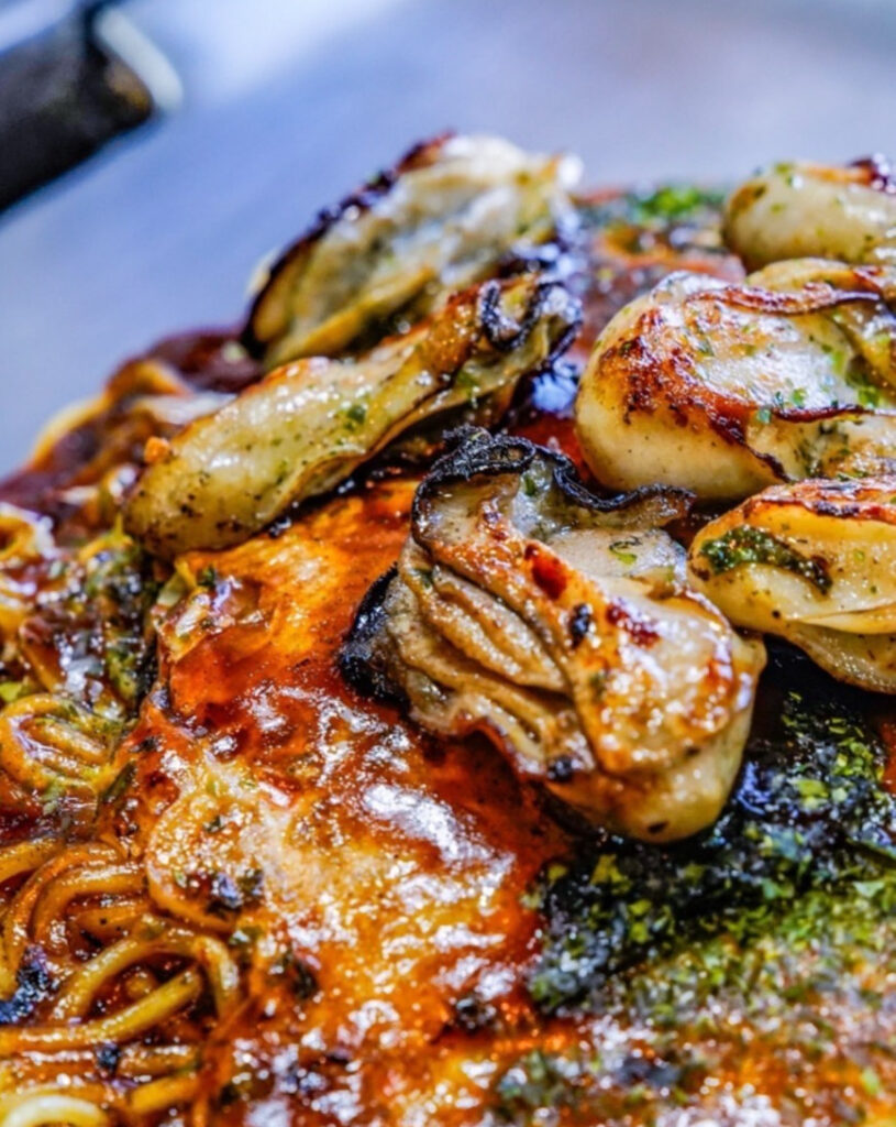 高温の鉄板で焼き上げた、そば入り広島風お好み焼。